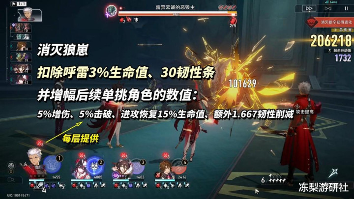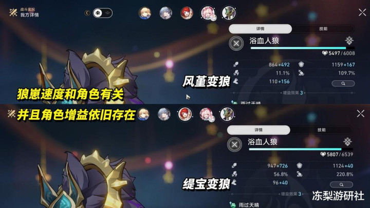 优势属性「风=量子>火=物理>虚数」,末日呼雷不能只看首领的弱点,还需考虑两侧狼崽弱点。对局中需要频繁消灭两侧狼崽,以此削减中间锁弱点的呼雷韧性条。