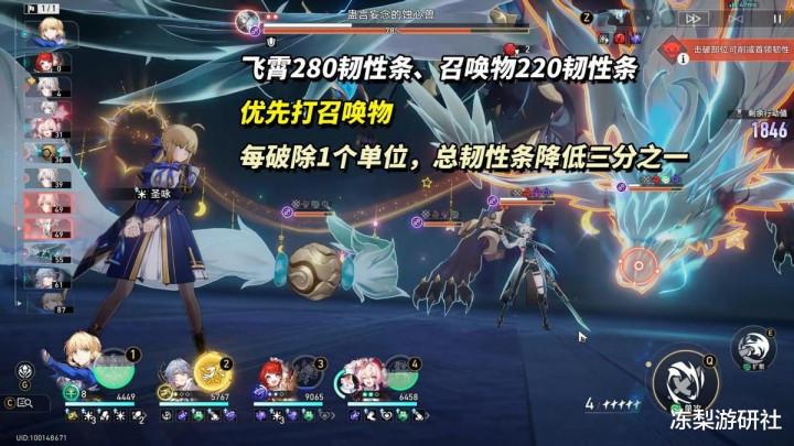 ①弱点击破规则。飞霄280韧性条,其余3个召唤物220韧性条,击破3个敌方单位,敌方全体进入弱点击破状态。由于敌方血量共享,更推荐优先打召唤物。