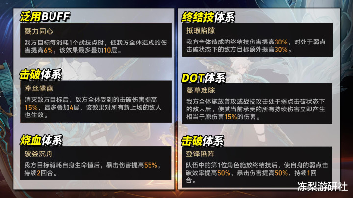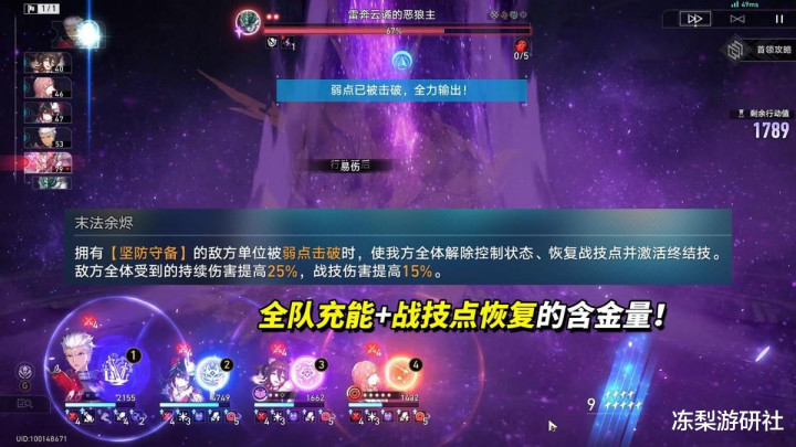 击破首领弱点后,全队解除控制、恢复战技点、激活终结技,这意味着在削韧阶段可放肆挥霍,一些耗点大C或终结技难充的角色体验将大幅提升。此外本期敌方还有25%DOT易伤、15%战技易伤。