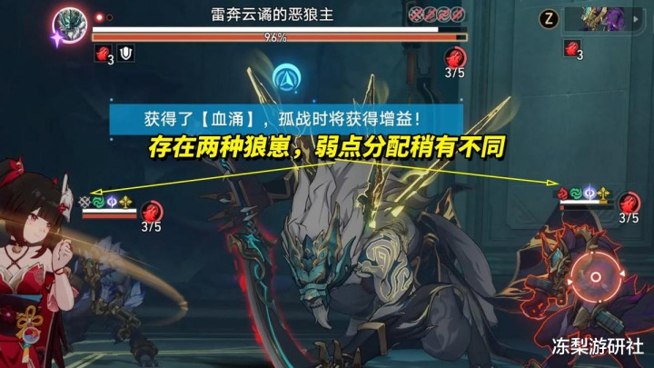 消灭狼崽可削减呼雷3%生命值、30韧性,并获得血涌层数,每层使进入孤战的角色获得增益“5%增伤、5%击破、进攻恢复15%生命值、额外1.667韧性削减”至多5层。