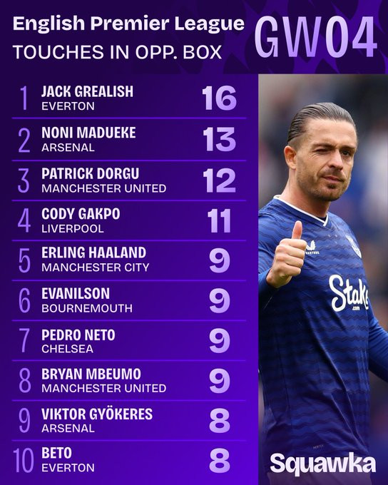 虎扑09月15日讯Squawka数据统计,英超第4轮对方禁区内触球次数榜,格拉利什16次居首,马杜埃凯次席。