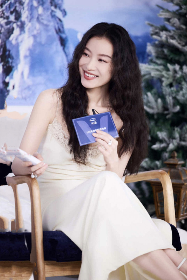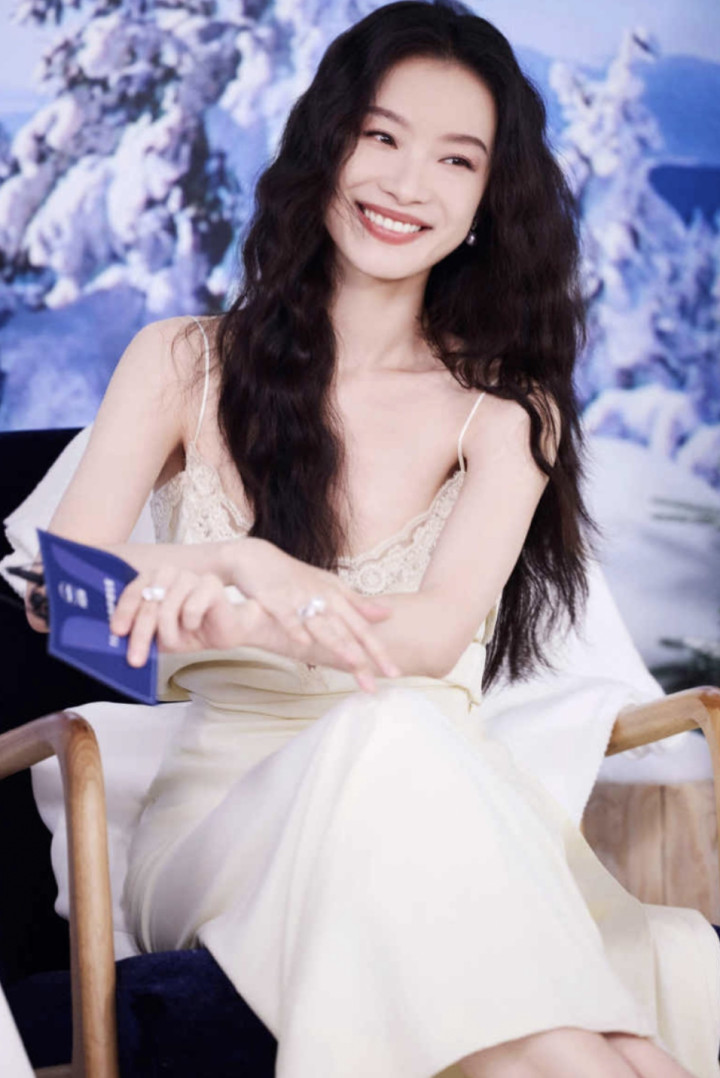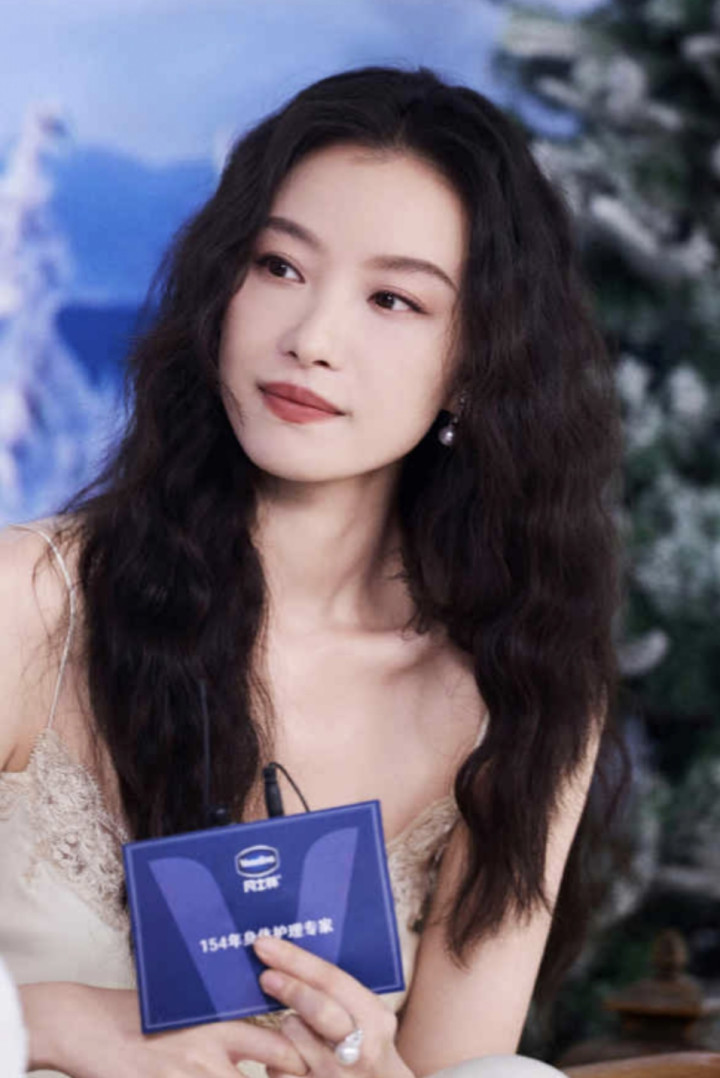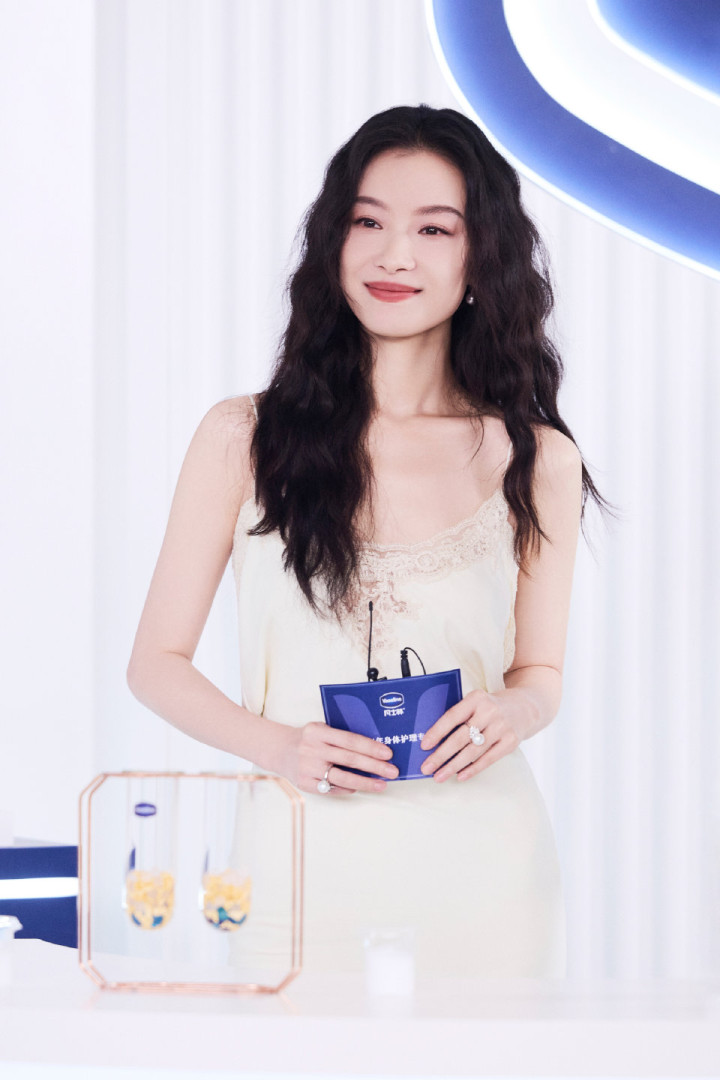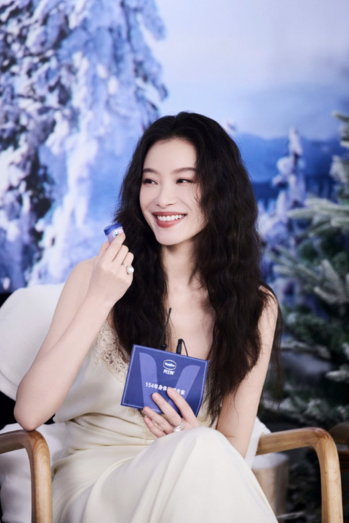 当她或端坐于蓝白撞色的场景中,手捧护肤单品浅笑嫣然;或立于冰雪背景前,以手交叠于身前,那袭白裙便成了情绪的延伸。雪纺的裙摆随姿态轻晃,似有微风掠过,将女性的柔媚与力量藏在褶皱里。这种风情,并非刻意的撩拨,而是从骨子里透出的舒展——她懂得如何与衣物对话,让时装成为自身气质的放大器,而非束缚。