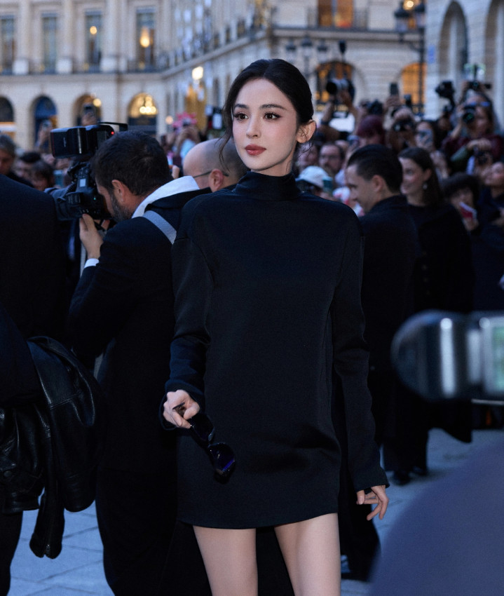 古力娜扎巴黎看秀, 身穿黑色露背连衣裙, 眼戴墨镜, 又酷又飒