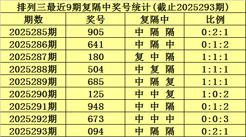 上期回顾:排列三第2025293期奖号为:094。大小比为1:2,奇偶比为1:2,012路比为2:1:0。